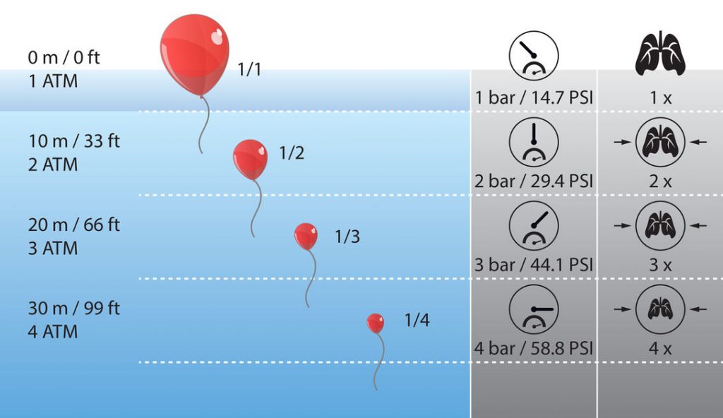 Així, és clar que aquestes masses queden reduïdes en un volum més petit a mesura que ens anem submergint a més profunditat, ja que la pressió exercida és més alta. Val a dir, que aquests canvis són més significatius dels 0 als -10 m de profunditat.